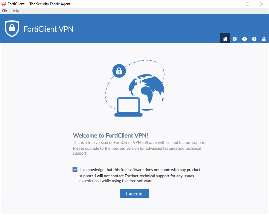 - Launch the client, click the “I acknowledge…” box and click “I accept” button.