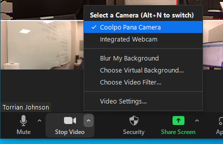 Plug the usb cable from the camera into the computer. Open zoom and at the bottom left of screen click the arrow next to "Stop Video" and select Coolpo Pana Camera from the list.