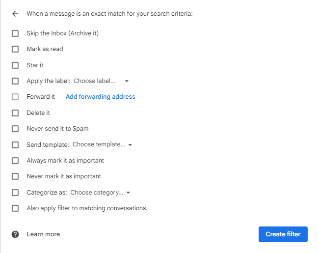 - Choose what you'd like the filter to do. Here, you have a multitude of options that you can choose for the specified type of emails. For example, to skip your inbox and be applied under a label you would click the "Skip the Inbox" and "Apply the label" boxes.