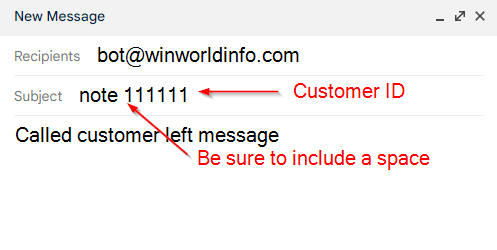 Send an email to bot@winworldinfo.com with the subject beginning with the word note followed by a space then the customer ID. In the message of the email type the comment to be added.