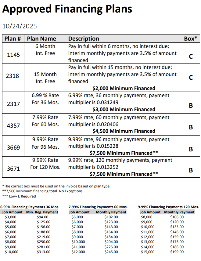 We are excited to announce we will be adding the 6.99% 36 month plan to our everyday offerings. This is an excellent opportunity to gain those customers who don't want the longer plans but need more than the interest free plans can offer. There is a $3000 Minimum for this plan. Please note that the code for this plan is 2317, and it should be recorded in Box B. If you have any more questions, please don't hesitate to contact your sales manager.