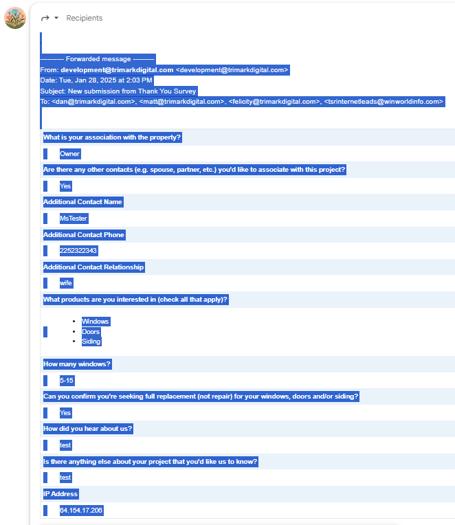 If there is a second email with the subject "New submission from Thank You Survey", do the same process to forward it, select the text (Ctrl+A), and copy it (Ctrl+C):