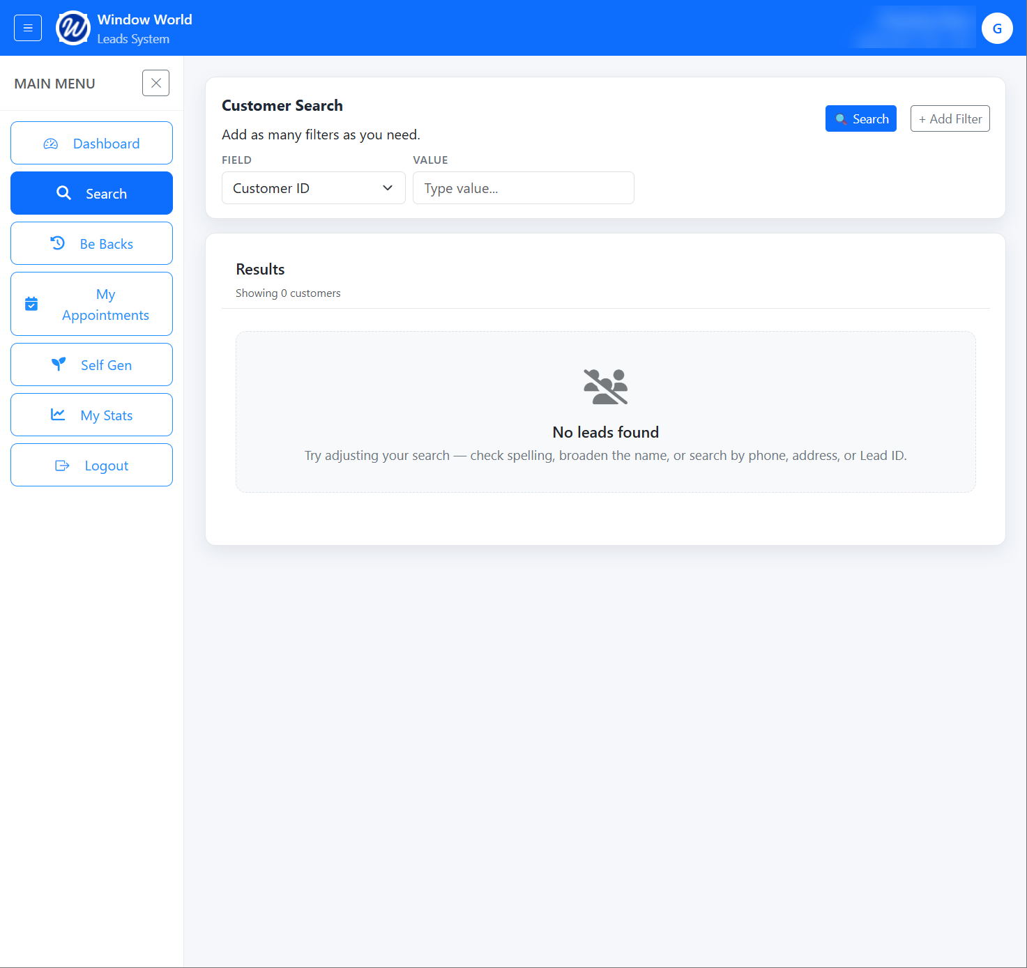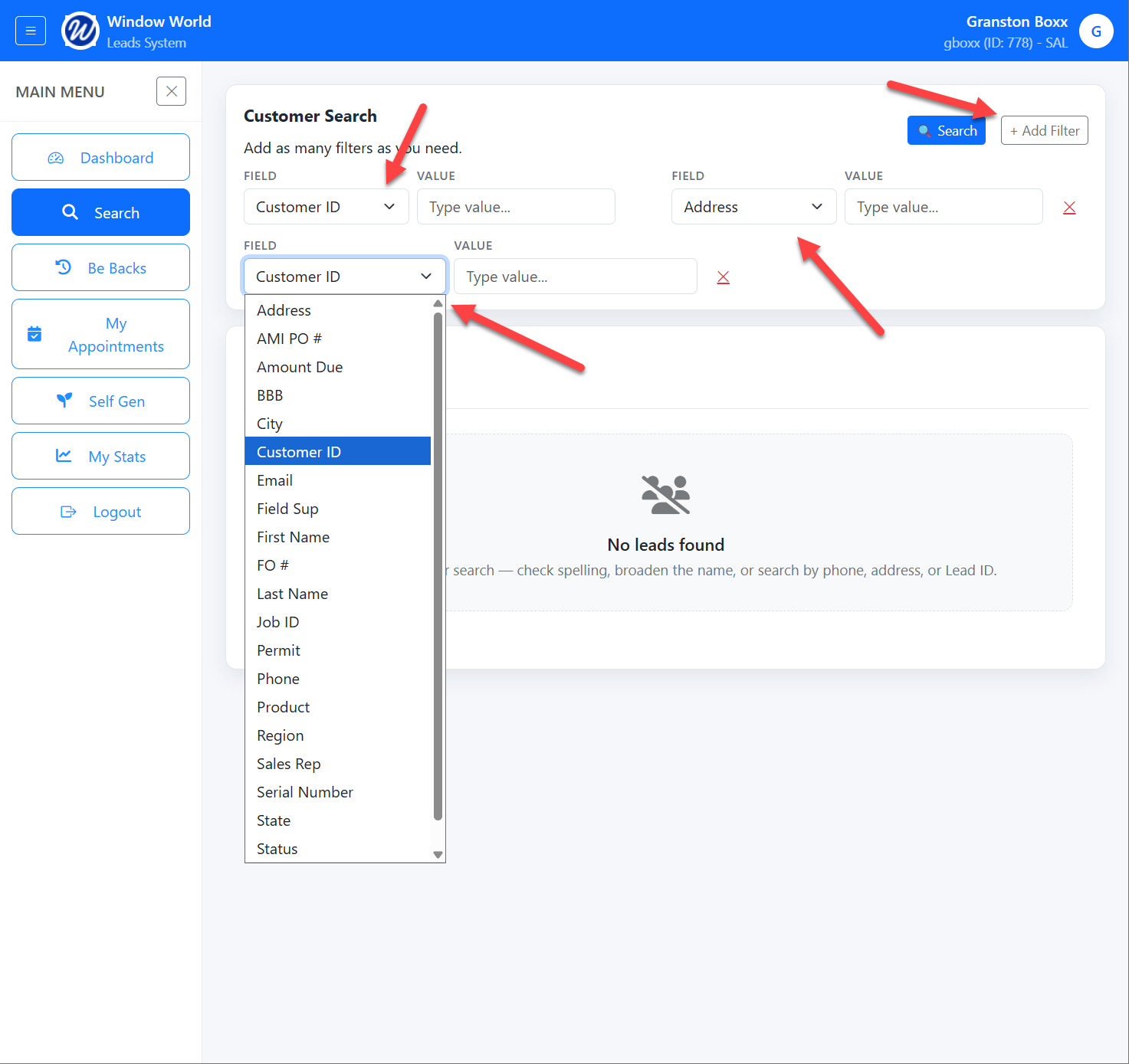 Click + Add Filter to include additional search criteria. Each filter lets you select a field and value.