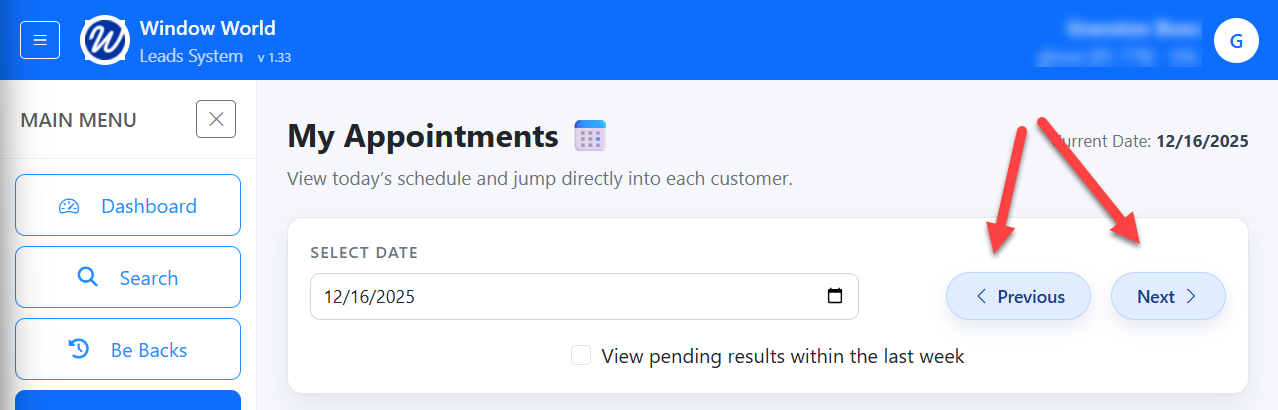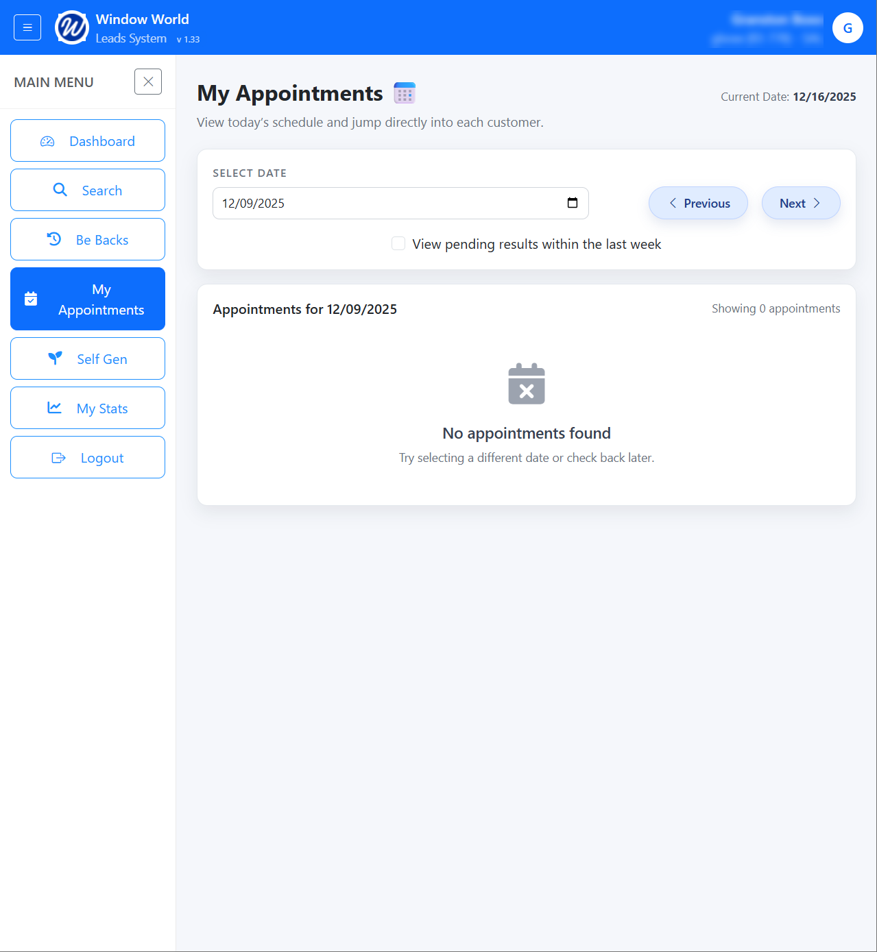 On the My Appointments page, you can view the daily appointments based on the selected date: