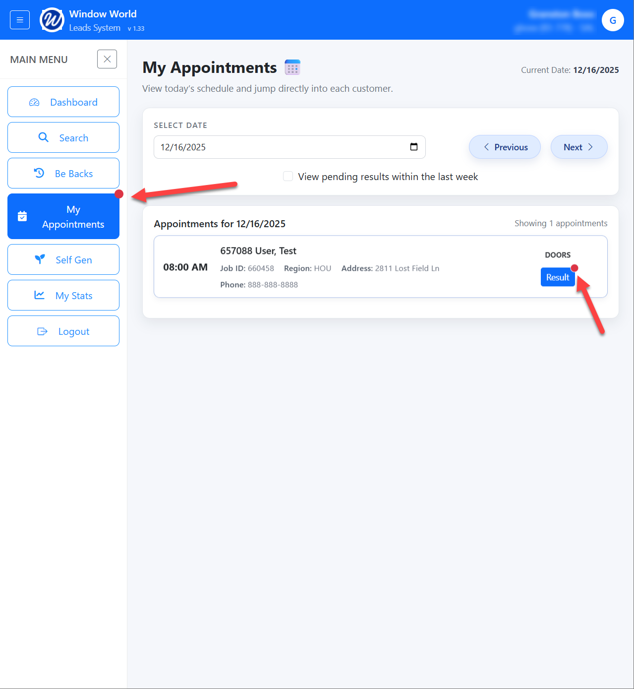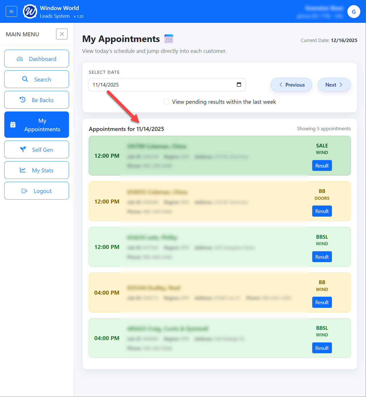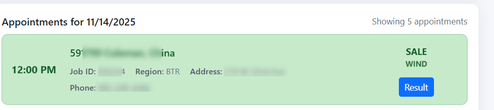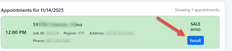 Additionally, the appointments with no result will have a red dot next to the Result button.